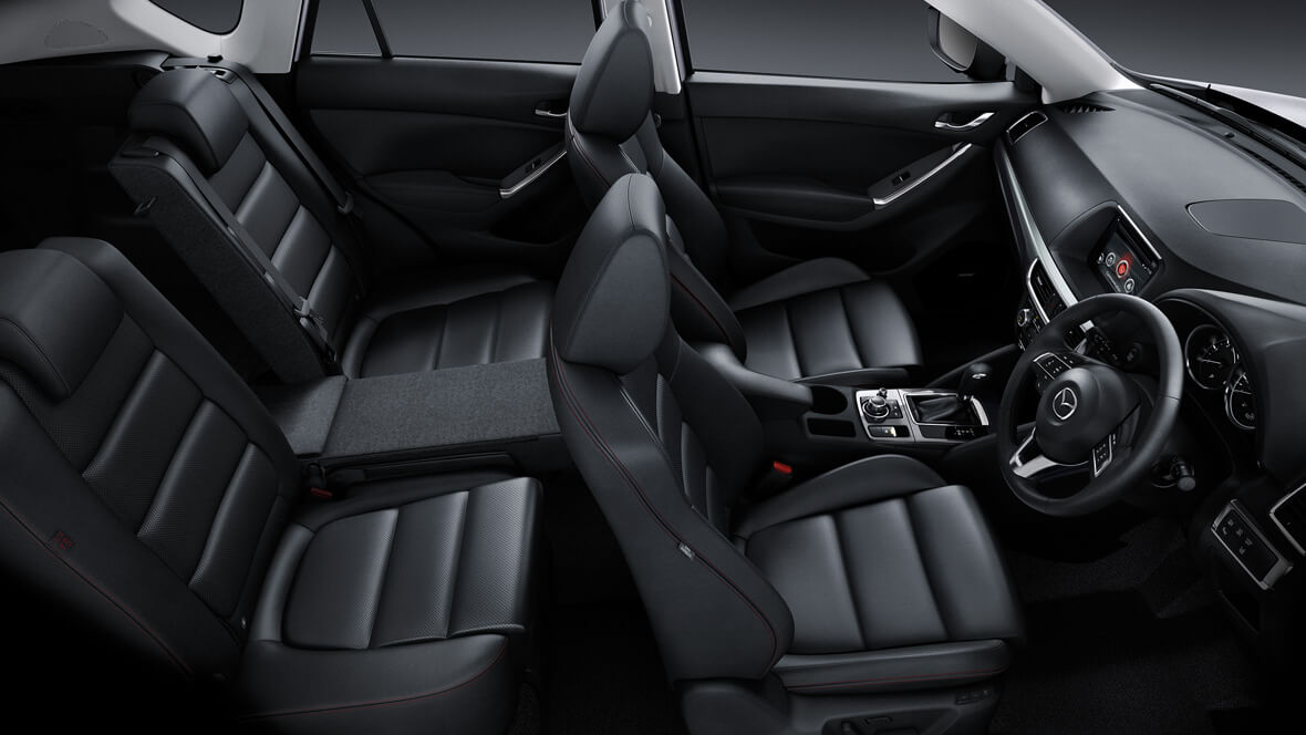 ภายในห้องโดยสารของ Mazda CX-5 เหนือกว่าด้วยการออกแบบที่เปี่ยมด้วยกลิ่นอายแห่งความหรูหราสไตล์ยุโรป วัสดุภายในบ่งบอกถึงคุณภาพและรสนิยมที่เหนือระดับ เบาะหนังสีดำเข้ม แต่งตะเข็บด้วยด้ายสีแดง Lining Stitch วัสดุแผงคอนโซลหน้า คอนโซลกลาง และแผงประตู แต่งด้วยสีเงินวาวและสีดำเงา ภายในห้องโดยสารกว้างขวางสะดวกสบายยิ่งขึ้น โดยพนักพิงแถวหลังสามารถแยกพับได้ 3 ส่วน แบบ 40:20:40 อิสระจากกัน เบาะนั่งคู่หน้าปรับไฟฟ้า พร้อมหน่วยความจำ 2 ตำแหน่งด้านผู้ขับ และระบบเบรกมือไฟฟ้าที่ถูกจัดวางในตำแหน่งที่สะดวกสบายต่อการใช้งาน พร้อมที่วางแก้วน้ำ และช่องเก็บของหลายจุดภายในรถ ทำให้ Mazda CX-5 เป็นรถ SUV ที่โดดเด่นกว่าในทุกมุมมอง